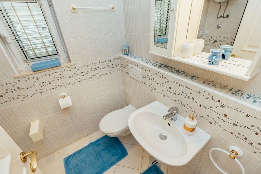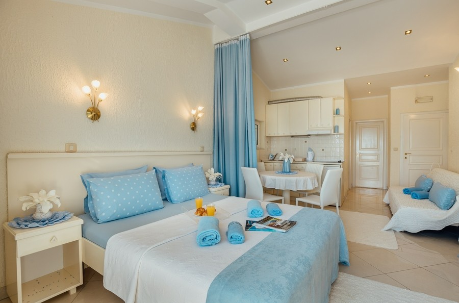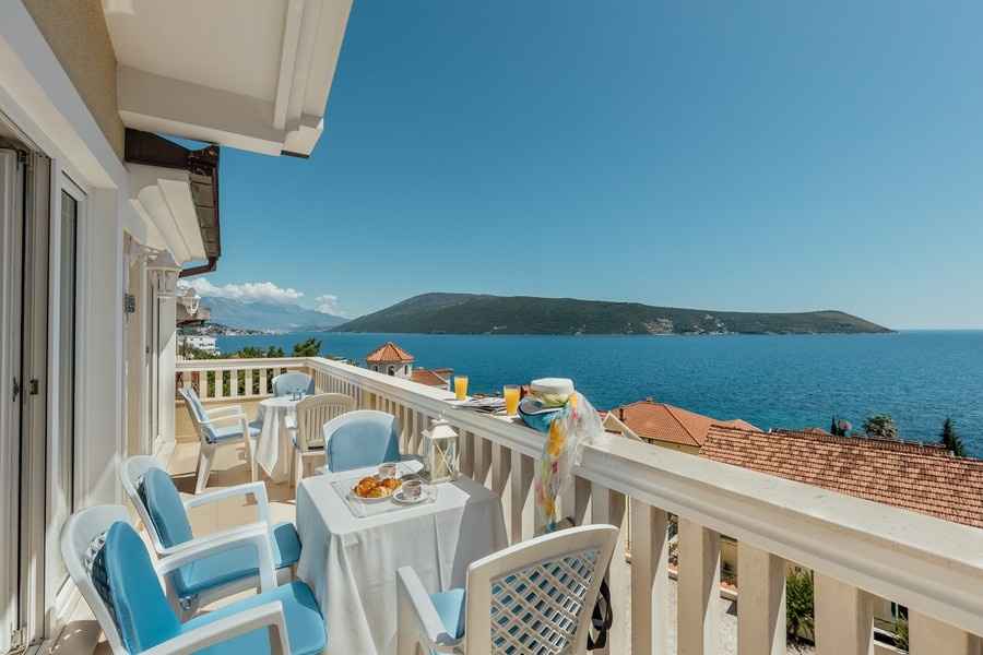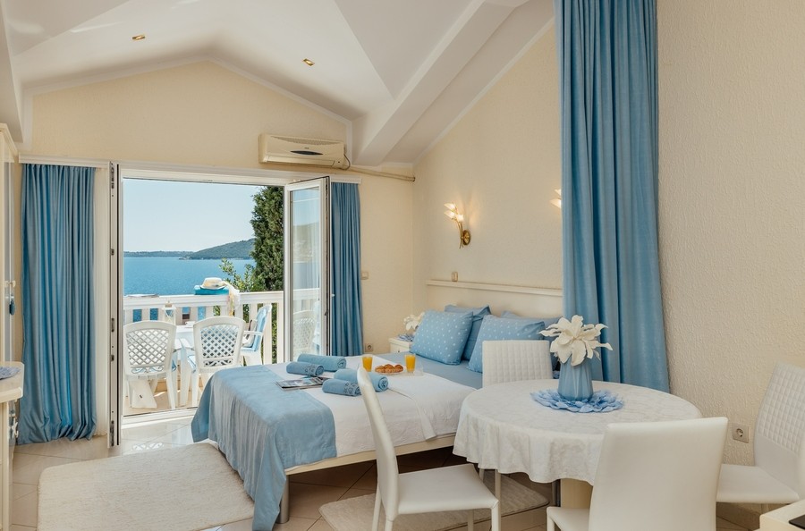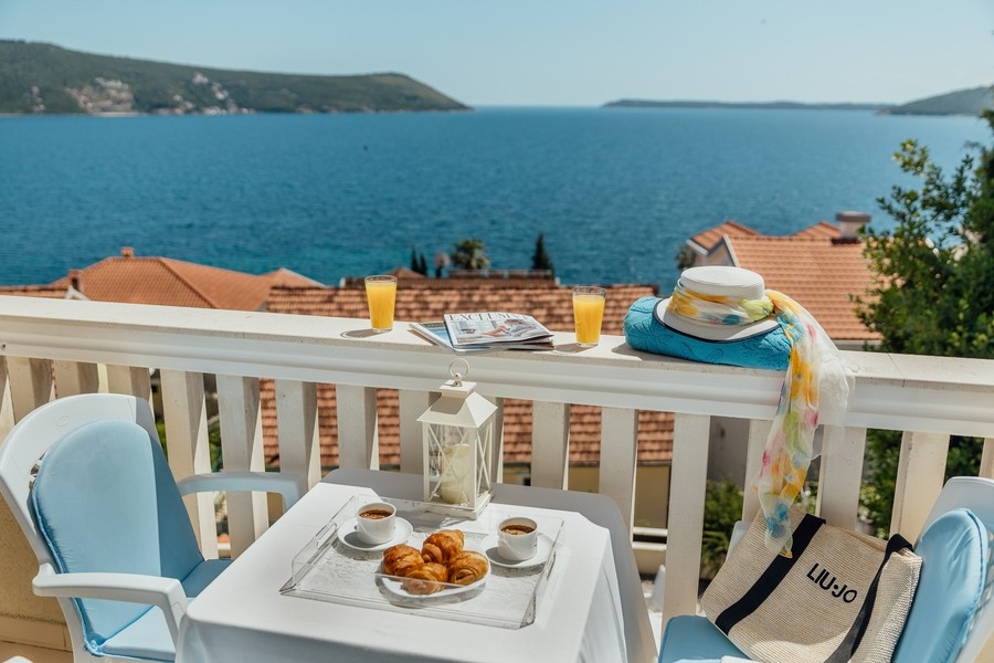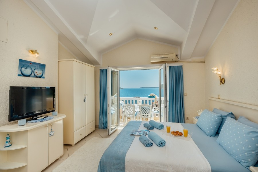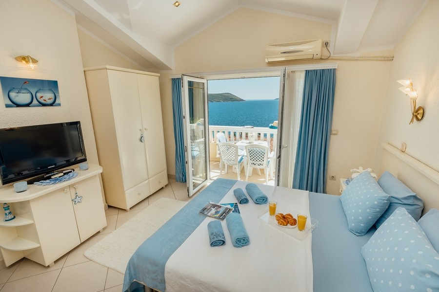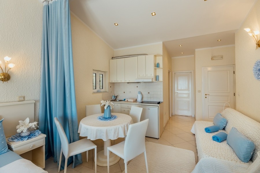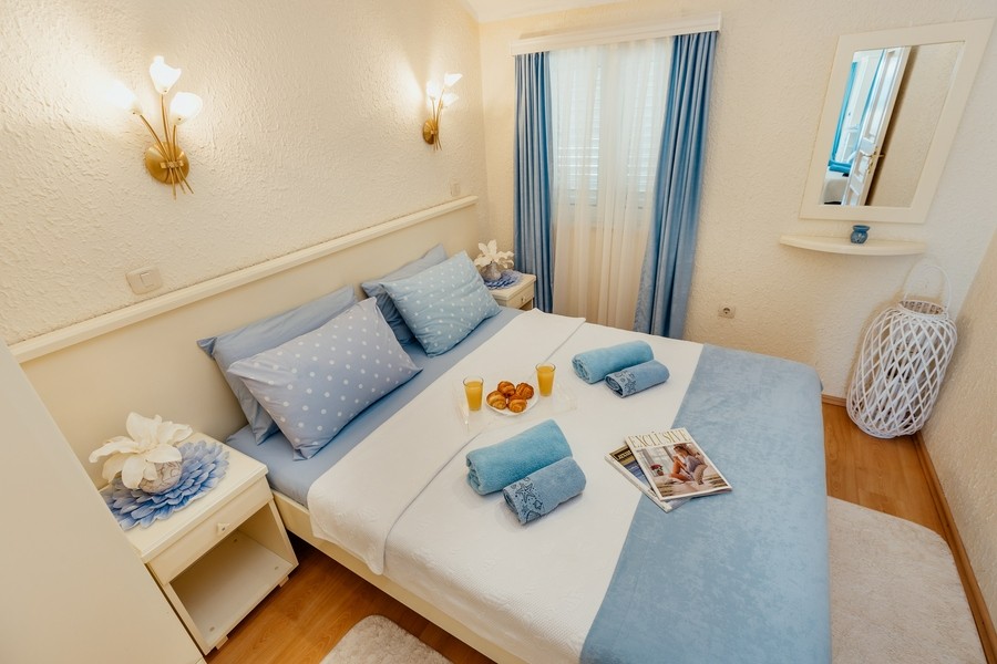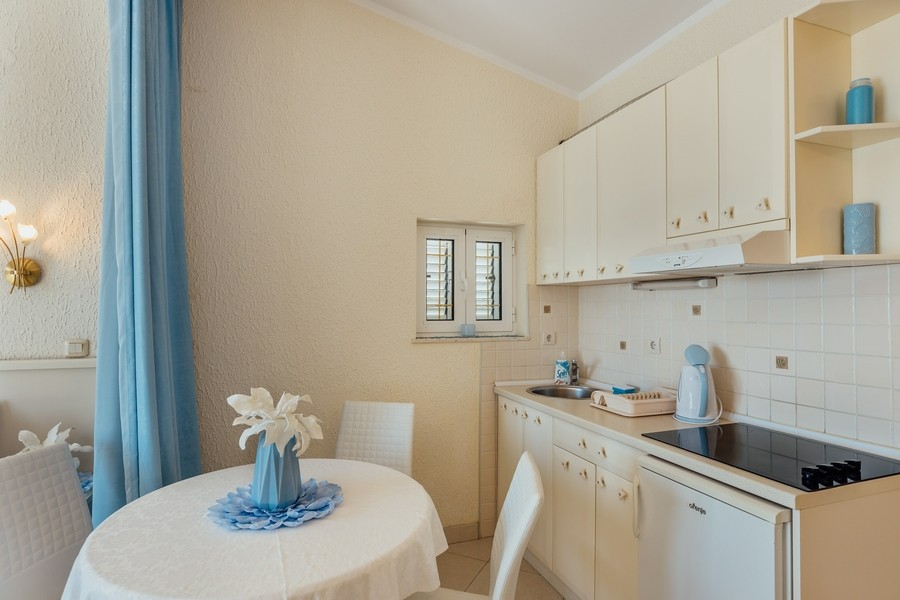 Prostrani apartman idealan za porodicu. Apartman se sastoji iz odvojene spavaće sobe sa bračnim krevetom, drugog bračnog kreveta koji je od trpezarije odvojen pregradom, mini kuhinje, kupatila i terase sa pogledom na more.