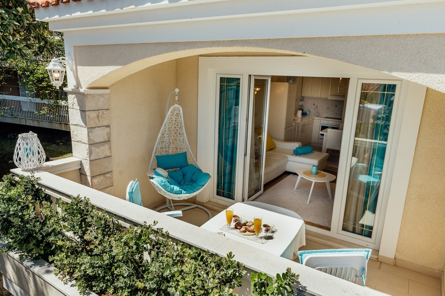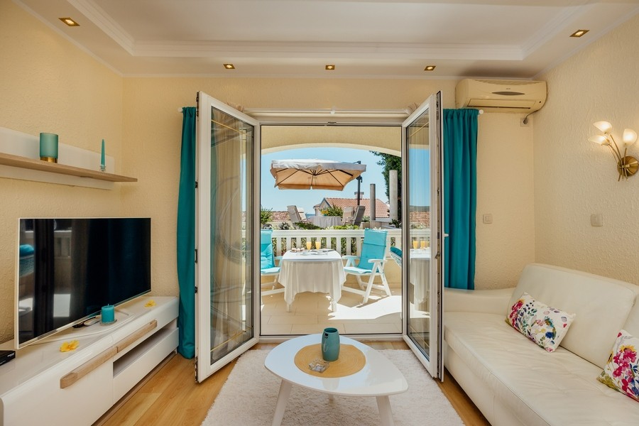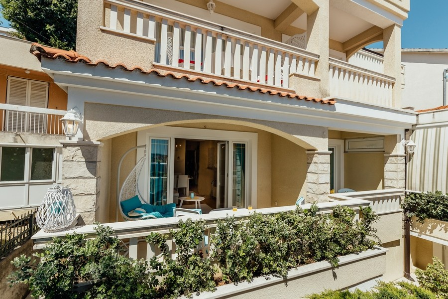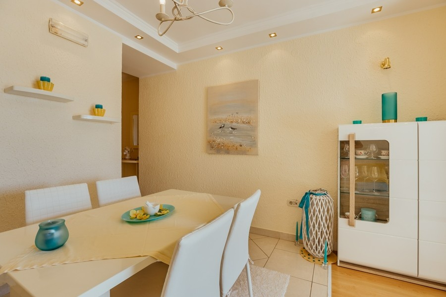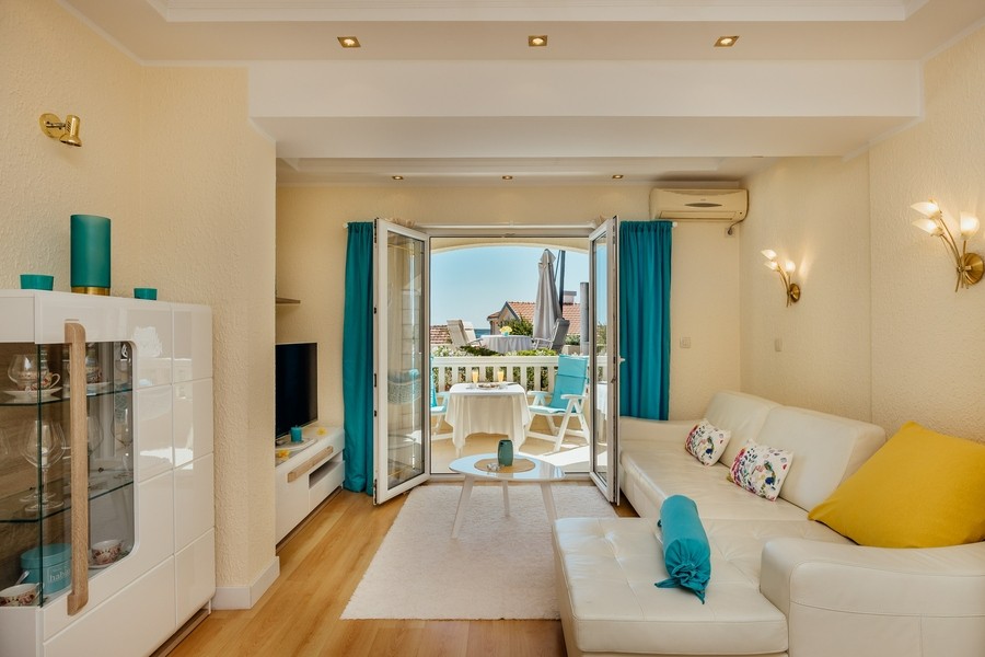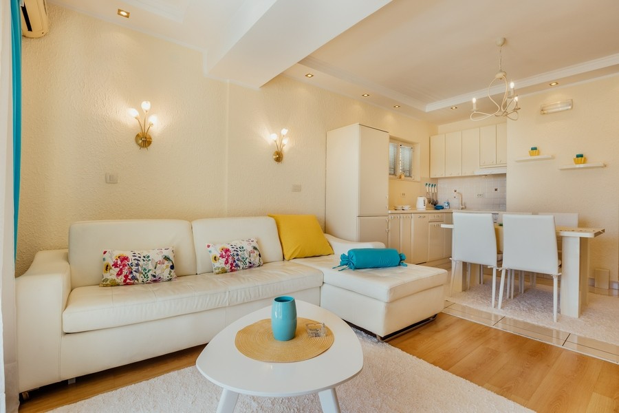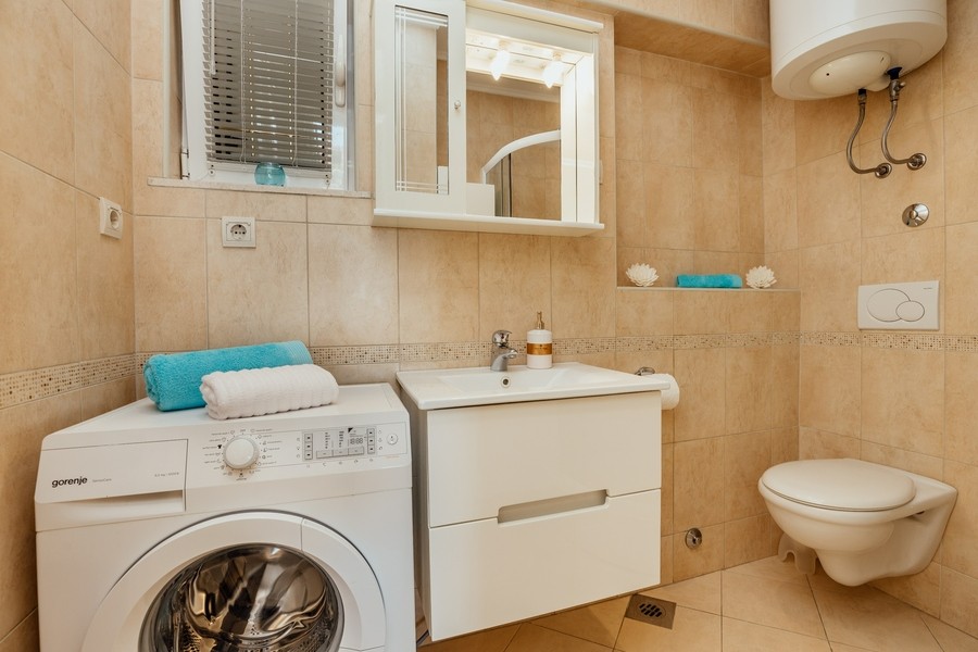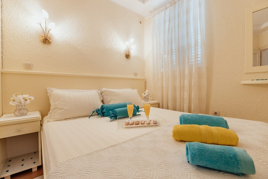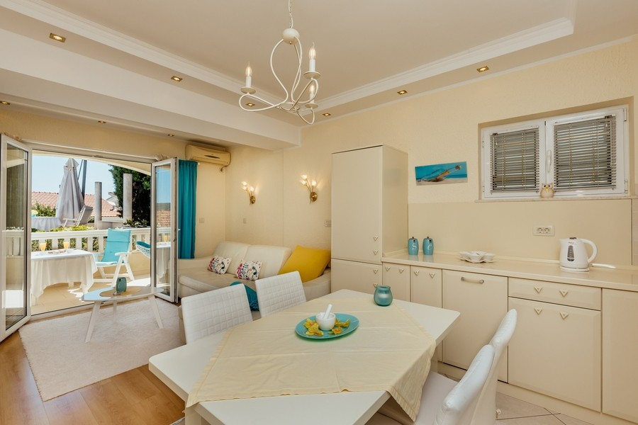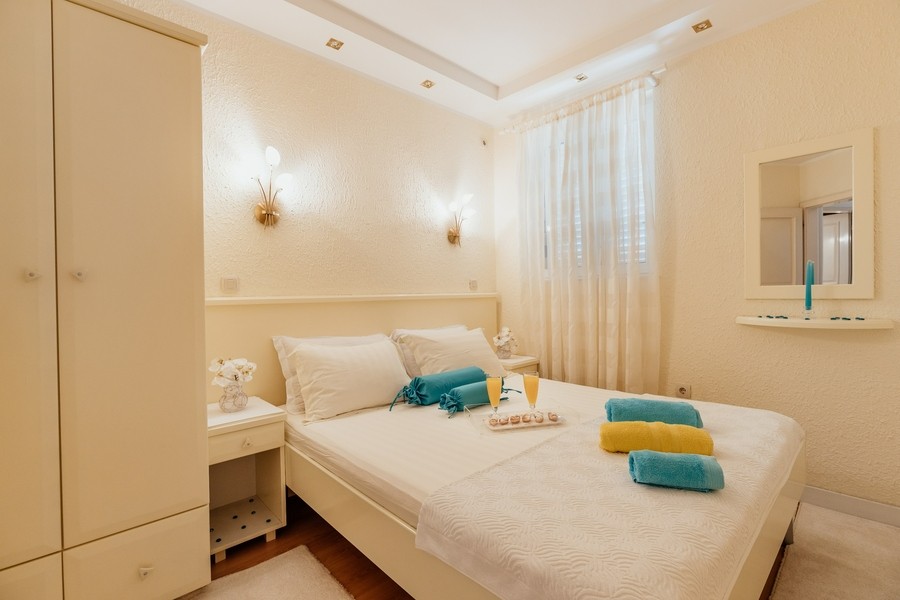 Prostran apartman savršen za porodicu ili prijatelje. Apartman se sastoji iz dvije spavaće sobe, jedna ima svoje kupatilo i sofu na izvlačenje, kuhinje koja je u potpunosti opremljena sa trpezarijom, dnevnog boravka, još jednog kupatila i 2 terase.